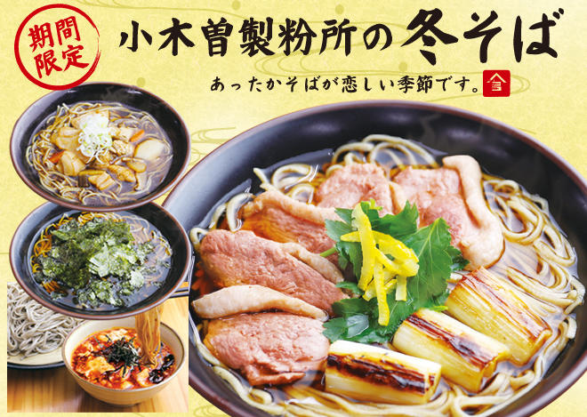 イベント・キャンペーン 【終了】2018-2019 期間限定「冬そば」 2018.11.20 小木曽製粉所では、11/20(火)より期間限定「冬そば」のご提供を開始しました。 冬ならではの食材や、冬に食べたい食材を使用した4種類のそばメニュー、 トッピングのかき揚げをご用意いたしました。 メニュー詳細は下記URLよりご確認いただけます。 あったかそばが恋しい季節です。。。 ぜひこの冬も「小木…続きを読む