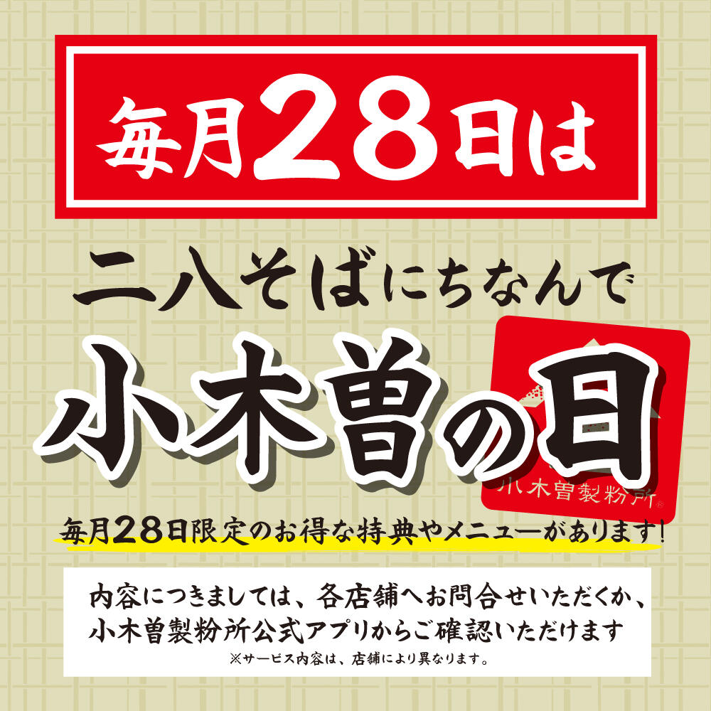 いつも小木曽製粉所をご利用いただき、ありがとうございます。 今月4月より、小木曽製粉所のそばが『二八そば』であることにちなんで... 毎月 28日 を 『小木曽の日』に制定致します!! 当日限定で、お得な特典やメニューをご提供する予定です。 お楽しみに! ※店舗により、提供するサービスの内容が変わり…続きを読む