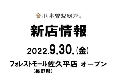いつも小木曽製粉所をご利用いただきまして、誠にありがとうございます。 2022年9月30日(金)に、 【信州そば処 小木曽製粉所 フォレストモール佐久平店】 がオープン致します。 ◆営業時間 11:00 ~ 15:00 (14:30L.O.) / 17:00 ~ 21:00 (20:30L.O.)…続きを読む
