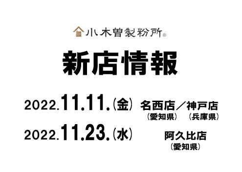 いつも小木曽製粉所をご利用いただきまして、誠にありがとうございます。 20年11月に新しく3店舗オープン致します。 【信州そば処 小木曽製粉所 神戸店】 ◆オープン 2022年 11月 11日 (金) ◆営業時間 11:00 ~ 21:00 ◆TEL:078 - 786 - 3900 ◆住所…続きを読む