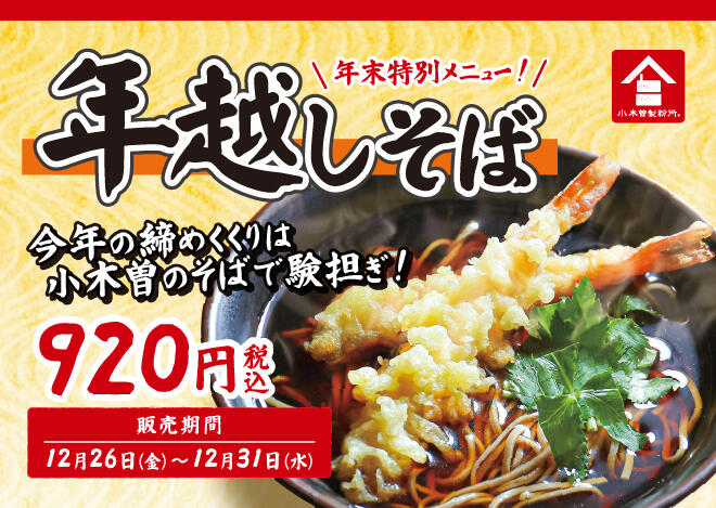 今年一年の感謝を込めて―― 年末特別メニュー『年越しそば』を販売致します! 「細く長く生きられますように」という、長寿の意味を持つ『そば』と、 同じく長寿のシンボルで、年末年始には定番の『エビ天』を2本! 【提供期間】 2025/12/26 ~ 2025/12/31 【価格】 920円…続きを読む