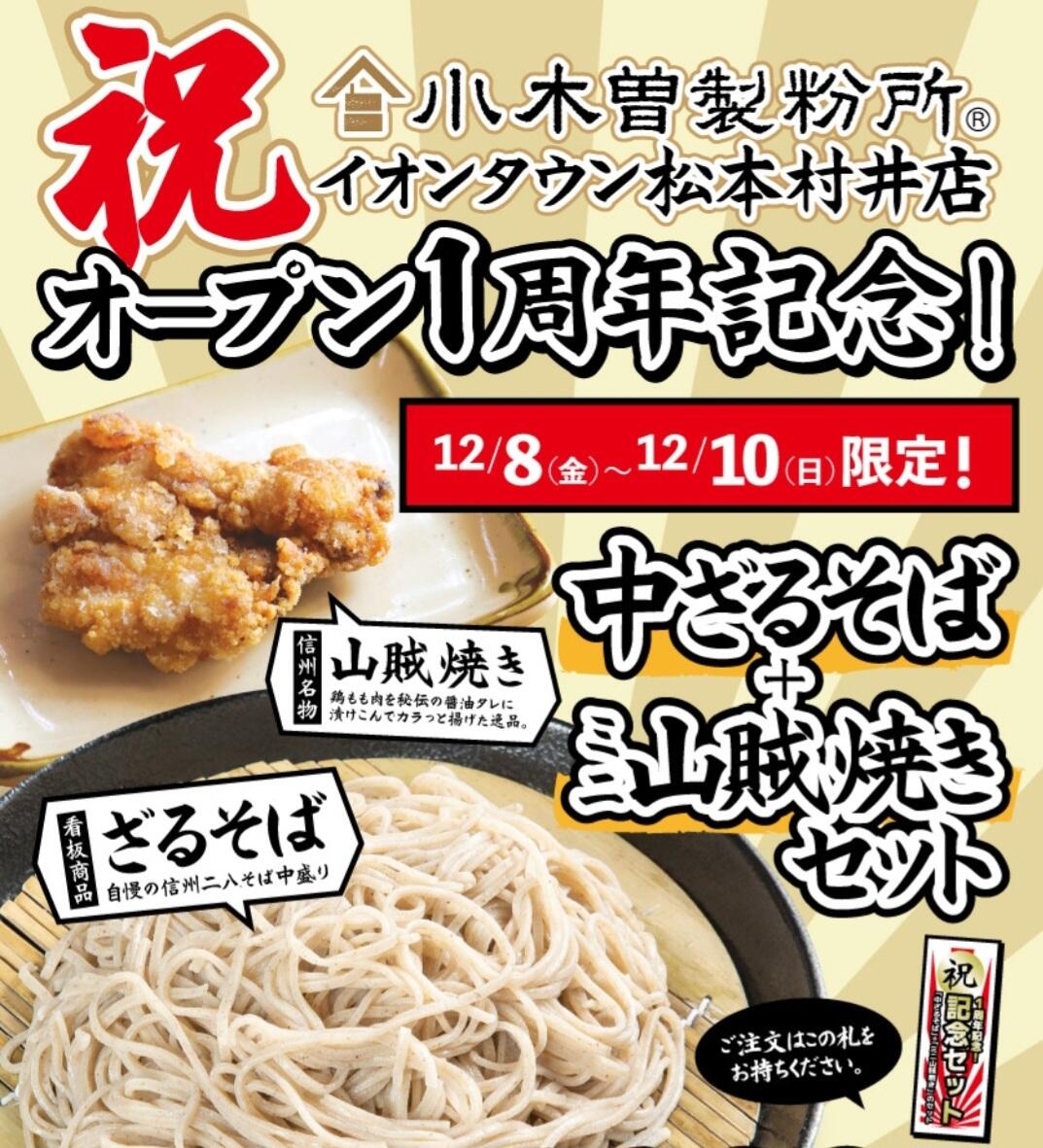 祝!イオンタウン松本村井店1周年キャンペーン おかげさまで、小木曽製粉所イオンタウン松本村井店は 移転オープンから1周年を迎えることができました! そこで日頃のご愛顧に感謝を込めて 大人気商品「ミニ山賊焼きと中ざるのセット(通常価格790円)」を なんと600円でご提供いたします! この機会にぜひイ…続きを読む