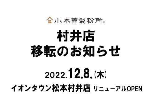 いつも小木曽製粉所をご利用いただきまして、誠にありがとうございます。 この度 小木曽製粉所 村井店 は、増床グランドオープン致しますイオンタウン松本村井敷地内へ移転することとなりました。 そのために、11月末に村井店を一度閉店致しまして、 12月8日に「小木曽製粉所 イオンタウン松本村井店」としてリ…続きを読む